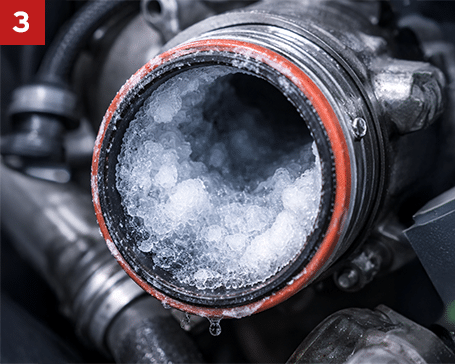 Unter diesen Bedingungen kann sich Kondenswasser im Ansaugbereich oder in der Ladeluftstrecke des Turboladers bilden. Sinkt die Temperatur weiter ab, besteht die Gefahr, dass dieses Kondenswasser gefriert. Die daraus entstehenden Eisablagerun-gen können sich in unterschiedlichen Symptomen bemerkbar machen und die Funktion des Turboladers beeinträchtigen.